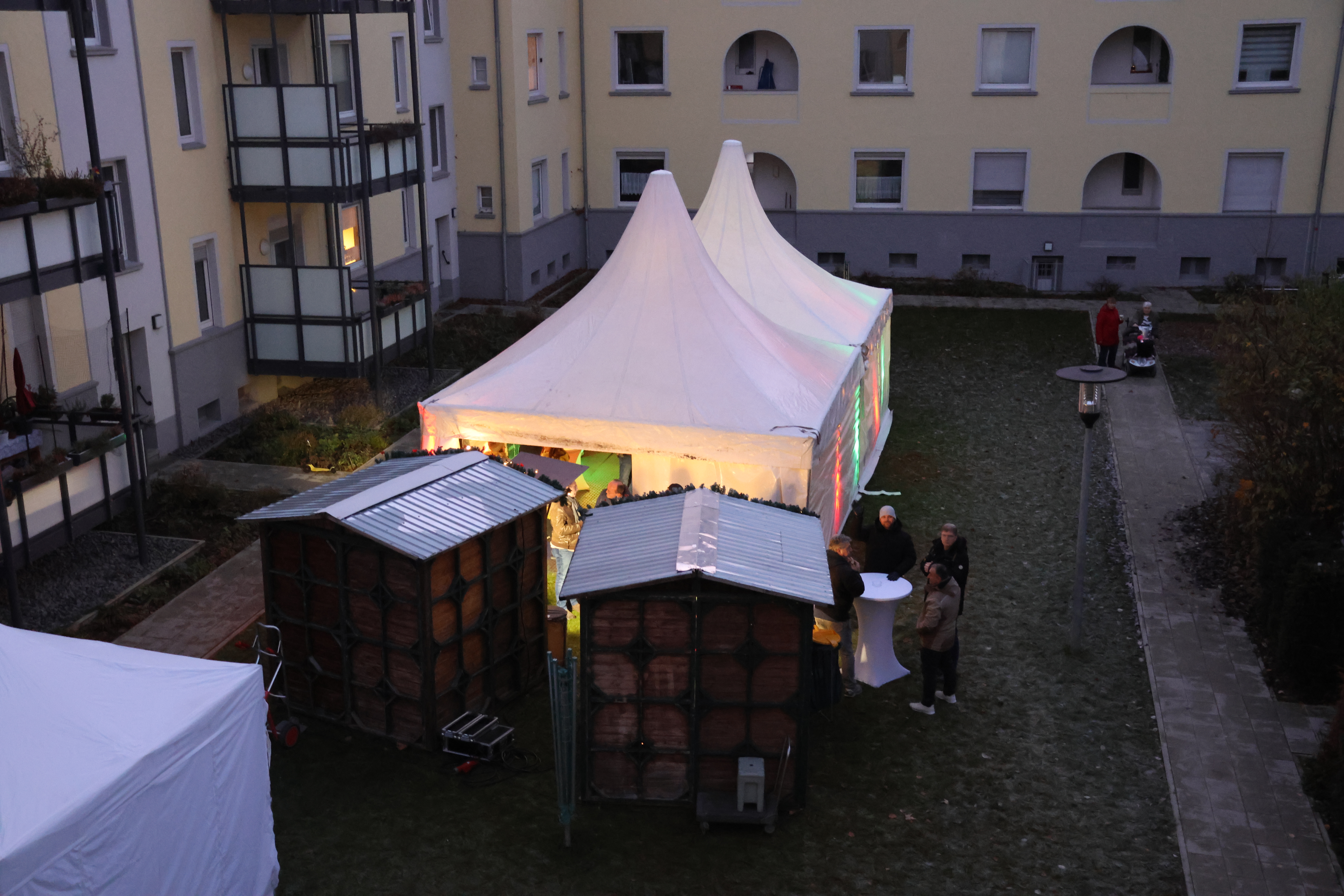 In dem neu gestalteten Innenhof herrschte an diesem Abend eine ganz besondere Stimmung. Zwischen warmen Lichterketten und dem Schein der Holzhütten entstand trotz der frostigen Temperaturen ein einladendes, winterliches Ambiente. An einer Hütte brutzelten Bratwürste auf dem Grill, Backkartoffeln wurden frisch ausgegeben und Crêpes mit Zucker oder Schokolade zubereitet. Die zweite Hütte bot dazu passende heiße und kalte Getränke an, die viele dankbar entgegennahmen. Wer sich zwischendurch richtig aufwärmen wollte, fand im beheizten Zelt einen gemütlichen Platz.