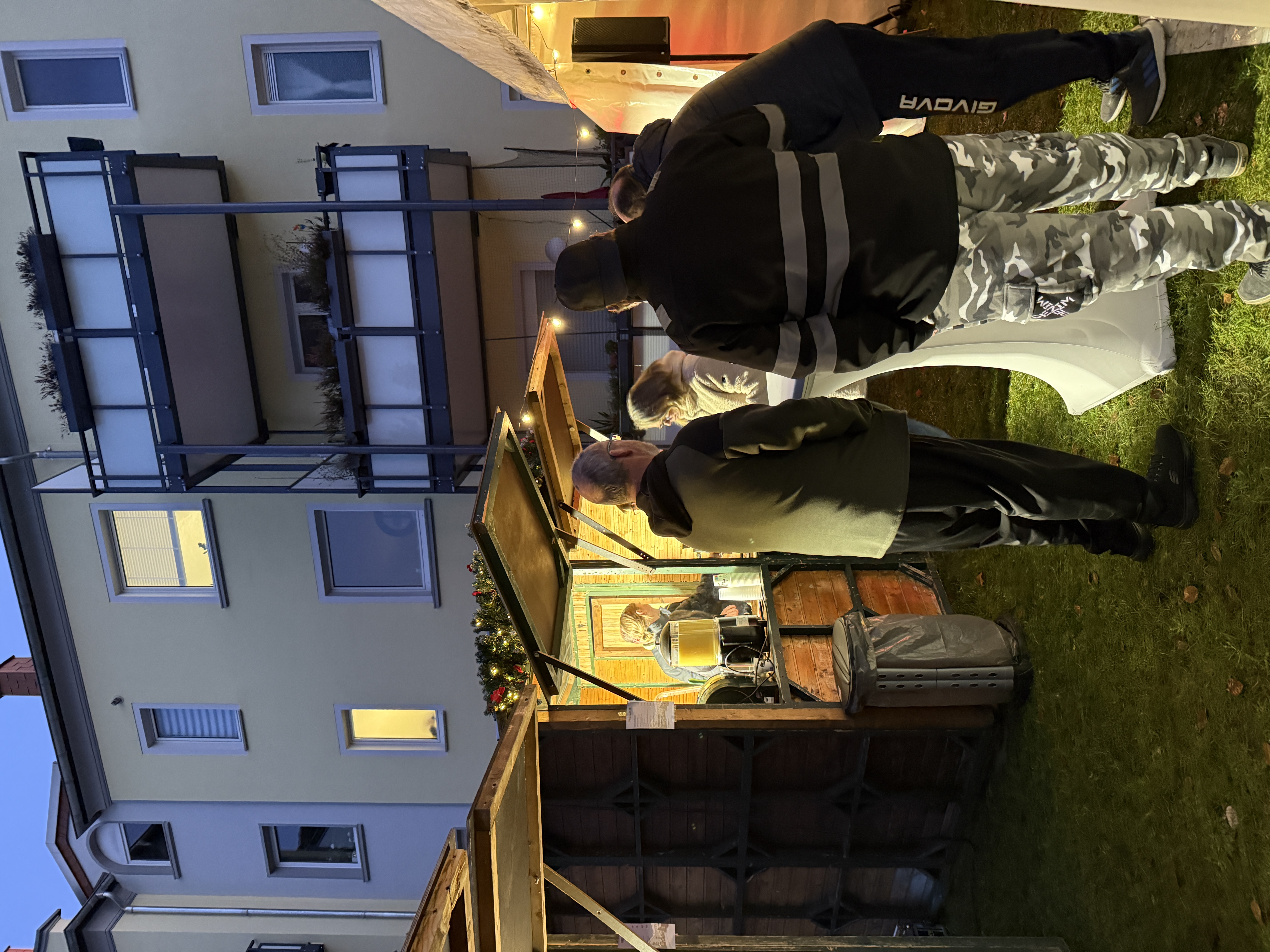 In dem neu gestalteten Innenhof herrschte an diesem Abend eine ganz besondere Stimmung. Zwischen warmen Lichterketten und dem Schein der Holzhütten entstand trotz der frostigen Temperaturen ein einladendes, winterliches Ambiente. An einer Hütte brutzelten Bratwürste auf dem Grill, Backkartoffeln wurden frisch ausgegeben und Crêpes mit Zucker oder Schokolade zubereitet. Die zweite Hütte bot dazu passende heiße und kalte Getränke an, die viele dankbar entgegennahmen. Wer sich zwischendurch richtig aufwärmen wollte, fand im beheizten Zelt einen gemütlichen Platz.