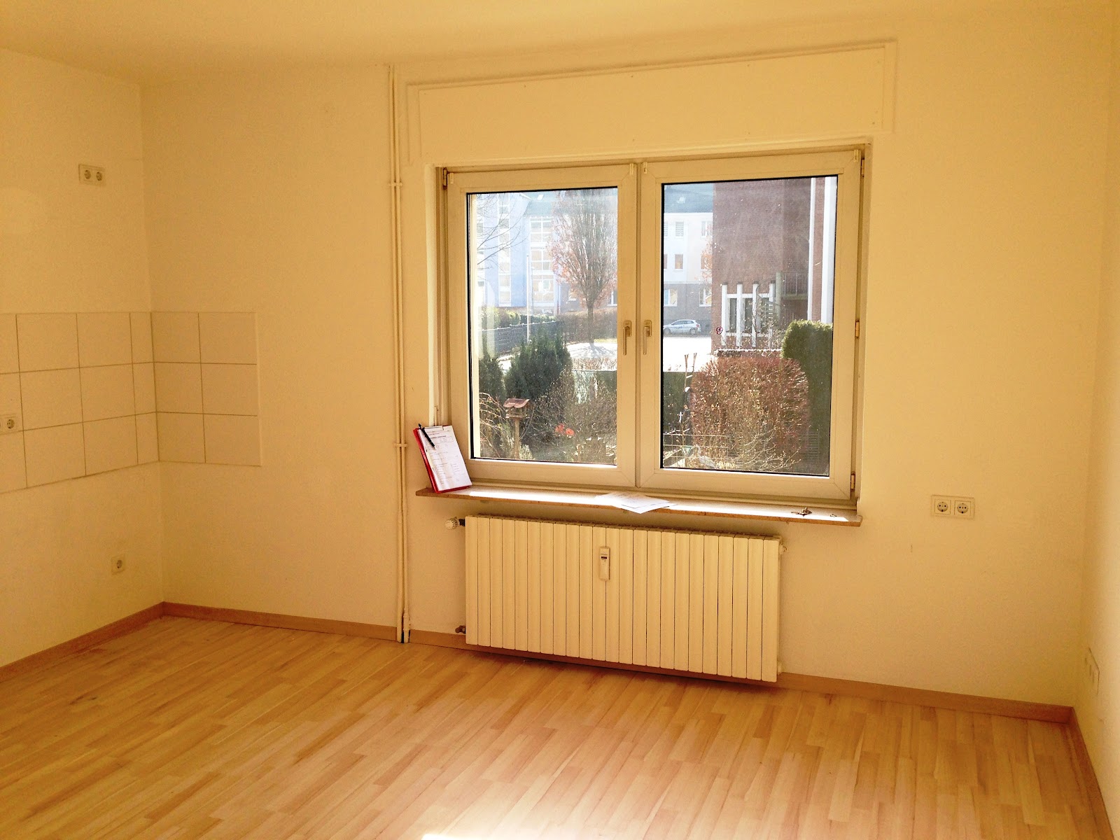 Die Wohnung verfügt über einen Laminatboden in Wohn-/Küche, Schlafzimmer und Dusche. Im Badezimmer sind Fliesen verlegt. Die Küche verfügt zudem über einen modernen, weißen Fliesenspiegel.